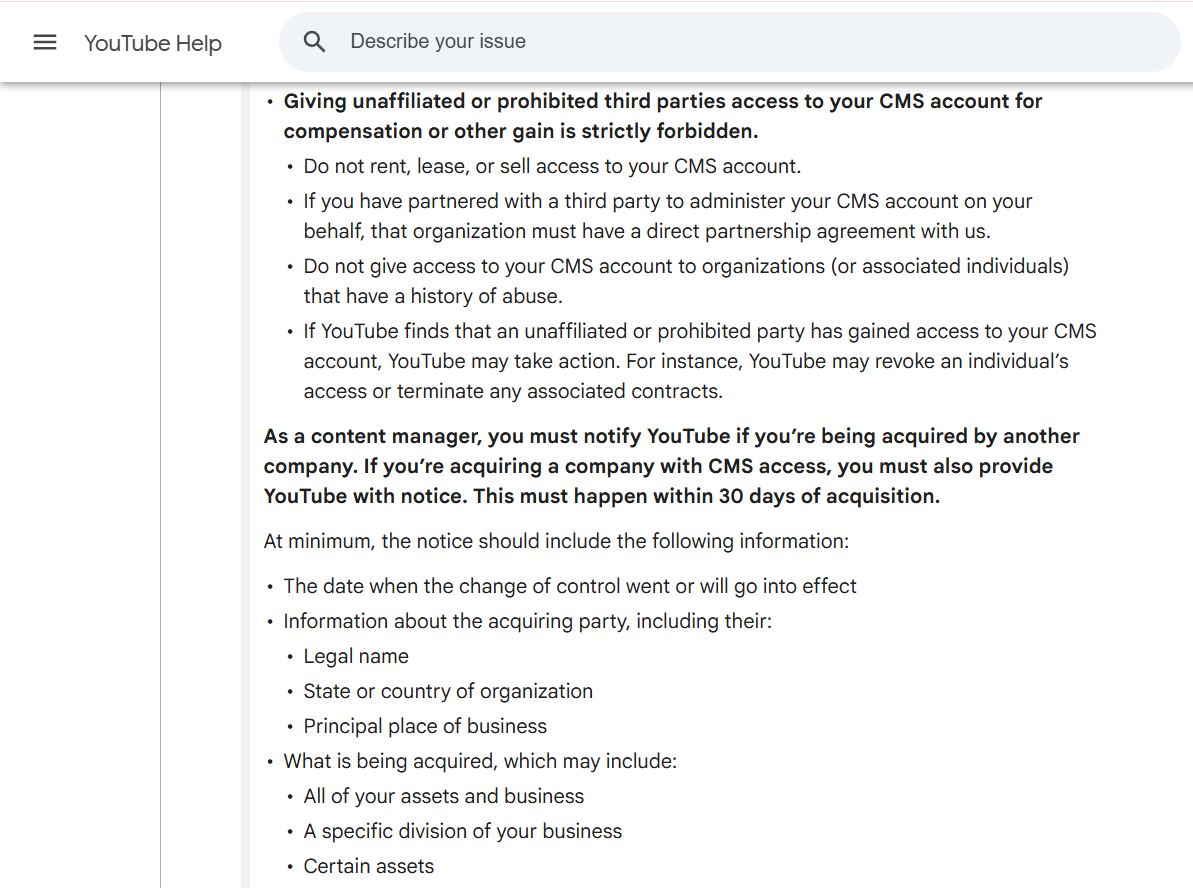 The CMS is granted to a specific legal entity that has entered into a direct agreement with YouTube. That agreement is not transferable. When someone sells a CMS account, they are not selling a product. They are transferring access to a platform relationship that legally belongs to them — and that transfer is not permitted under any circumstances.